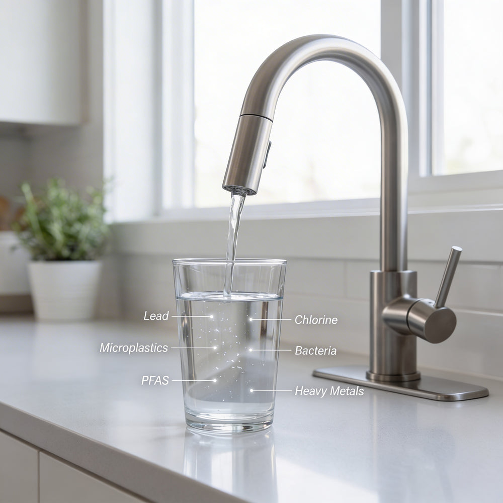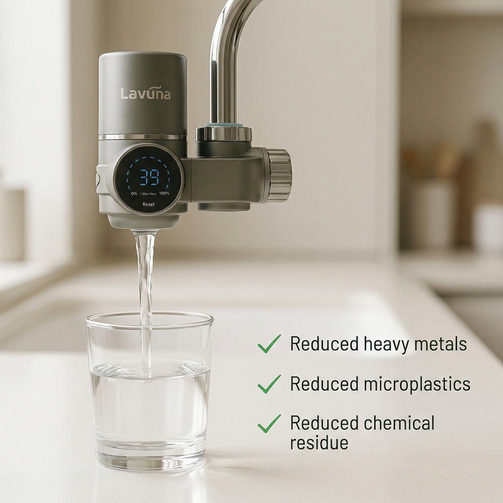 Layered filtration helps reduce heavy metals, microplastics, chlorine, and chemical residue while maintaining strong water flow.